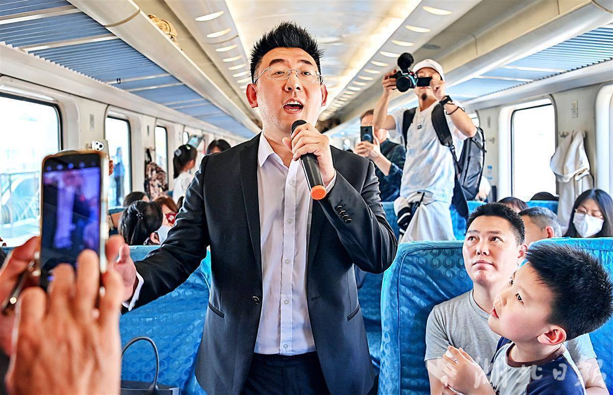 歌手在“武昌至武昌”5856次普速环线列车上表演,并与旅客互动。